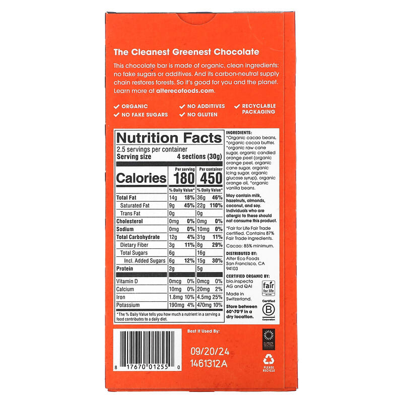 Inform when this item available: Alter Eco, Organic Dark Chocolate Bar, Orange Blackout, 85% Cacao, 2.65 oz (75 g) - 75.13 g / 0.09 / 0.2