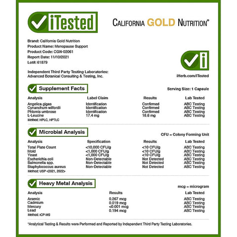 Inform when this item available: California Gold Nutrition, Beauty, Menopause Support with Angelica gigas, Cynanchum wilfordii, Phlomis umbrosa and L-Leucine, 30 Veggie Capsules - 30 Count / 0.05 / 0.1