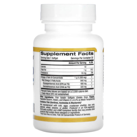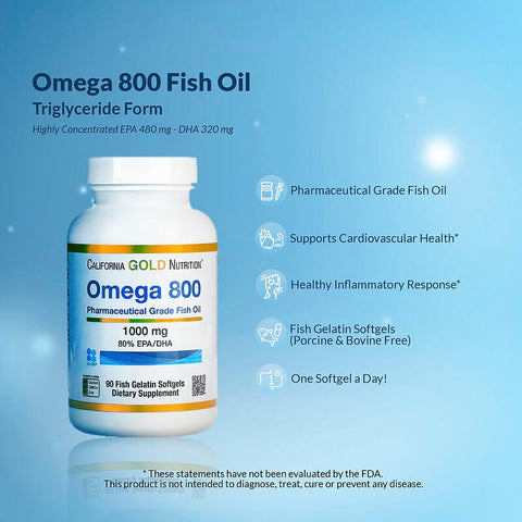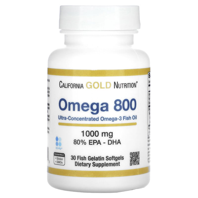 California Gold Nutrition, Omega 800 Ultra-Concentrated Omega-3 Fish Oil, kd-pur Triglyceride Form, 30 Fish Gelatin Softgels (1,000 mg per Softgel)