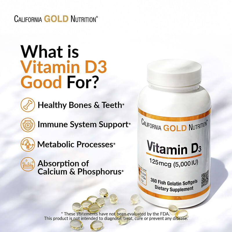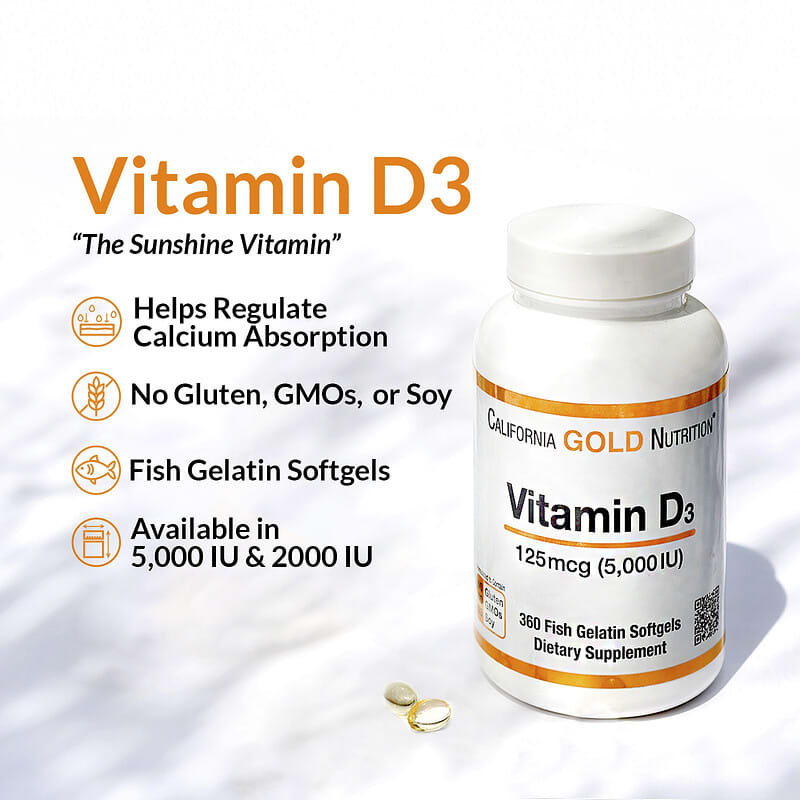 Inform when this item available: California Gold Nutrition, Vitamin D3, 125 mcg (5,000 IU), 90 Fish Gelatin Softgels - 90 Count / 0.04 / 0.098