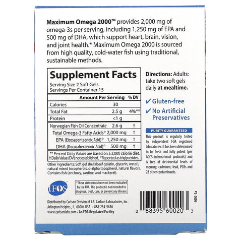 Inform when this item available: Carlson, Maximum Omega 2000, Natural Lemon, 30 Soft Gels (1,000 mg per Soft Gel) - 30 Count / 0.08 / 0.17