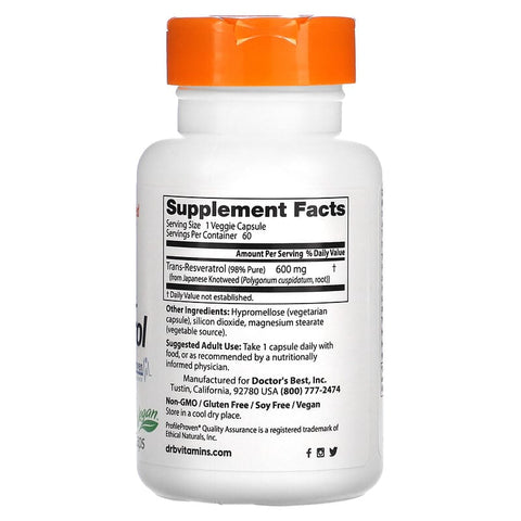 Inform when this item available: Doctor's Best, Trans-Resveratrol 600, 600 mg, 60 Veggie Caps - 60 Count / 0.07 / 0.15