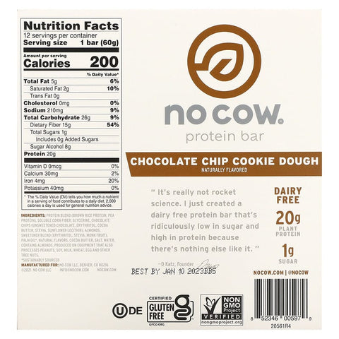 Inform when this item available: No Cow, Protein Bar, Chocolate Chip Cookie Dough, 12 Bars, 2.12 oz (60 g) Each - 12 Count / 0.77 / 1.705