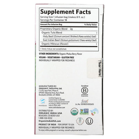 Organic India, Tulsi Hibiscus Tea, Caffeine-Free, 18 Infusion Bags, 1.27 oz (36 g) Sale