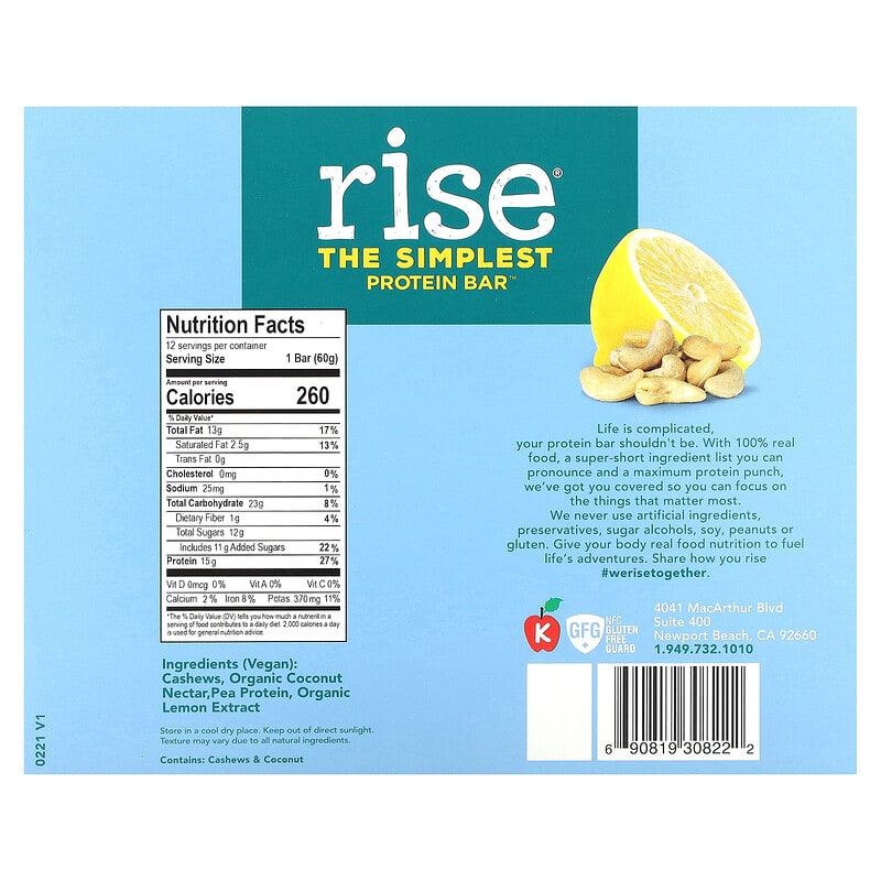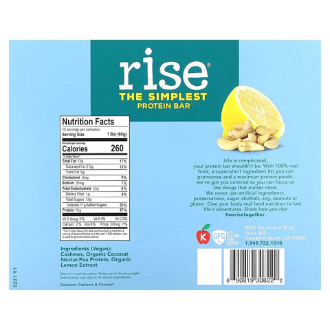 Rise Bar, The Simplest Protein Bar, Lemon Cashew, 12 Bars, 2.1 oz (60 g) Each Sale