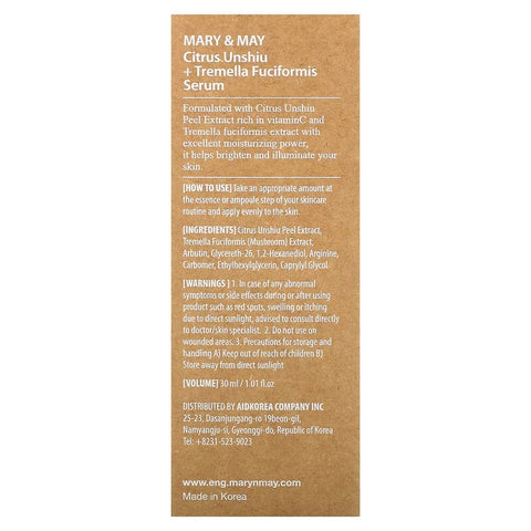 Mary & May, Citrus Unshiu + Tremella Fuciformis Serum, 1.01 fl oz (30 ml) - 29.87 ml / 0.11 / 0.25