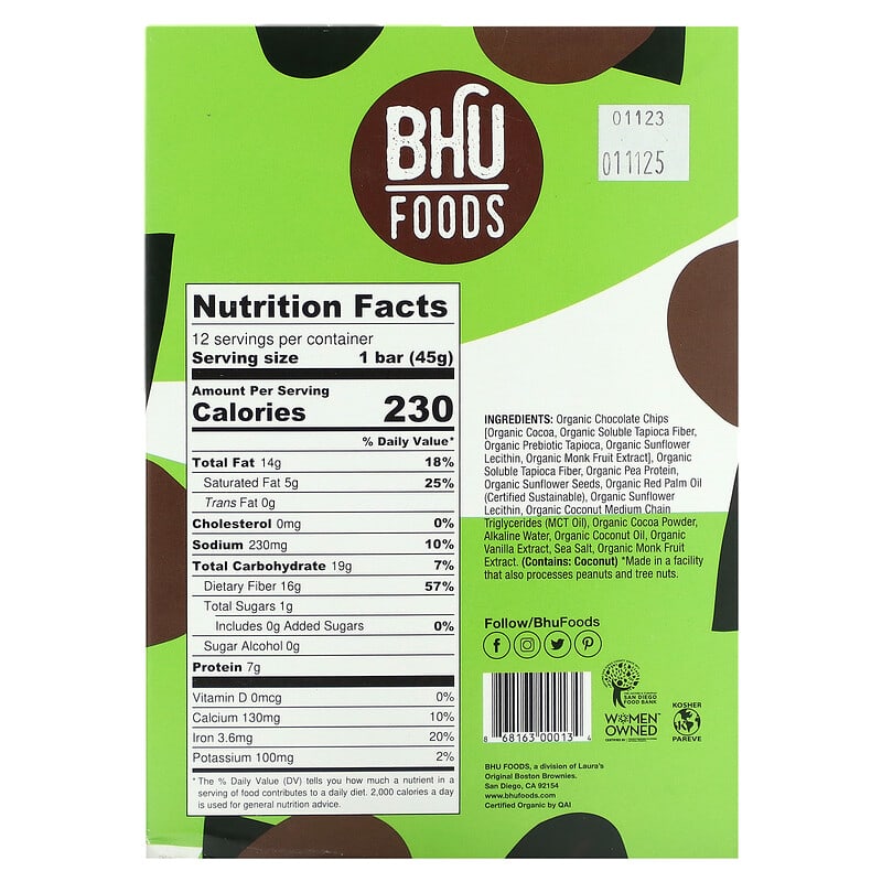 BHU Foods, Vegan Protein Bar, Double Dark Chocolate Chip, 12 Bars, 1.6 oz (45 g) Each Sale