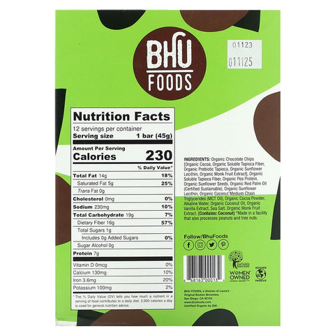 BHU Foods, Vegan Protein Bar, Double Dark Chocolate Chip, 12 Bars, 1.6 oz (45 g) Each - 12 Count / 0.61 / 1.35