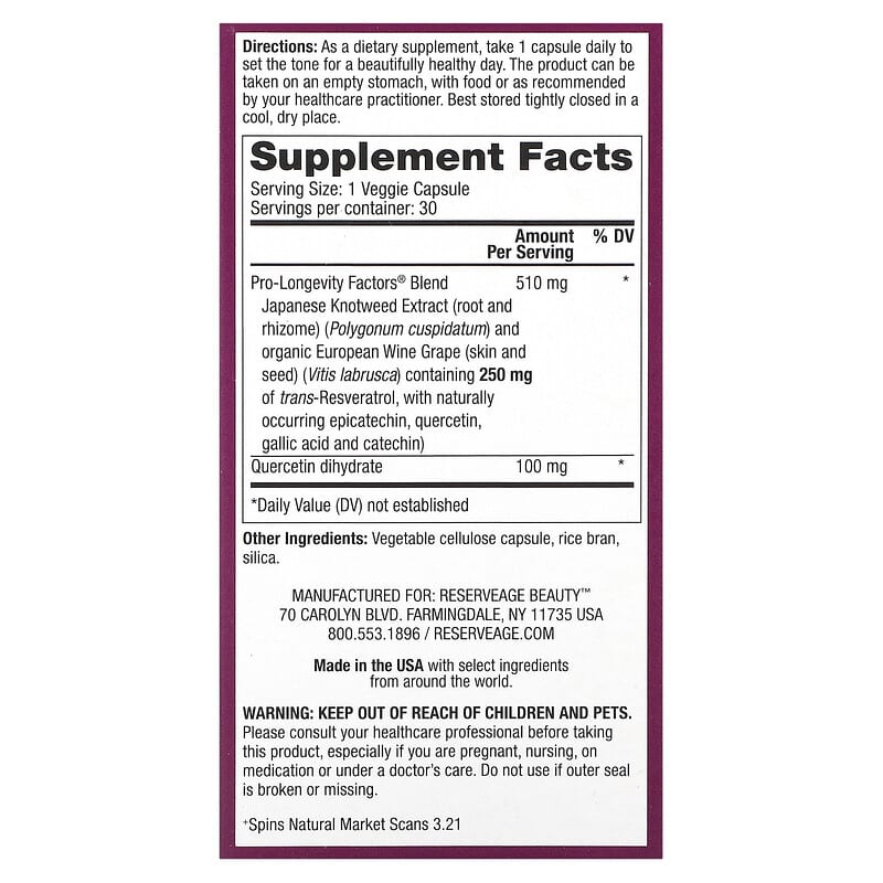 Inform when this item available: Reserveage Beauty, Resveratrol, 250 mg, 30 Veggie Capsules - 30 Count / 0.07 / 0.15