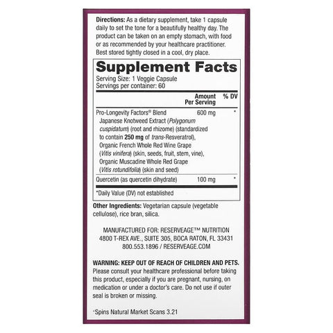 Inform when this item available: Reserveage Beauty, Resveratrol, Trans-Resveratrol, 60 Veggie Capsules - 60 Count / 0.11 / 0.235