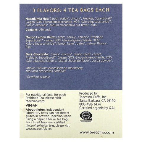 Inform when this item available: Teeccino, Prebiotic Herbal Tea Sampler, 3 Flavors, Caffeine Free, 12 Tea Bags, 2.54 oz (72 g) - 12 Count / 0.11 / 0.25